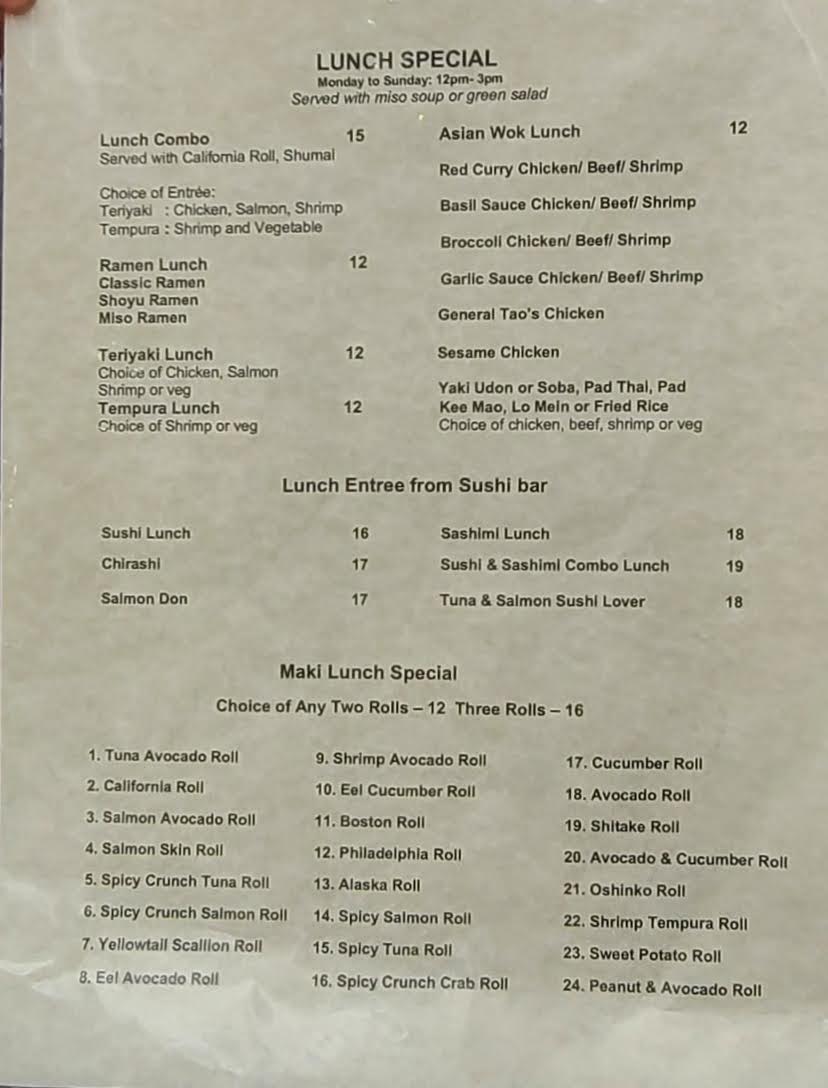 4 pieces sushi, 12 pieces sashimi special and tuna roll.