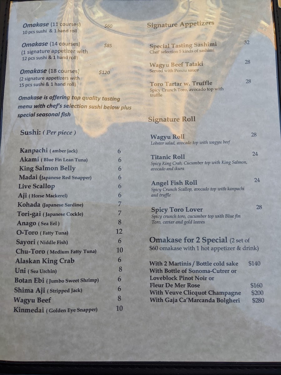 11 courses (10 pieces sushi & 1 spicy Toro roll). Omakase is offering top quality tasting menu with chef selections from (o-Toro, chu-Toro, madai, kinmedai, kanpachi, akamai, aji, kohada, king salmon, live scallop, anago, botan ebi, shima aji, king crab, uni, Wagyu, sayori and some special seasonal fish).
